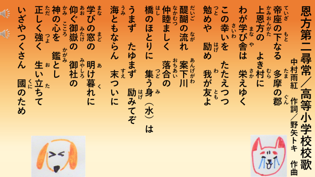 【写真】150周年行事スライドショーでは、5年生が国民学校当時の校歌を歌いました。時代を感じさせる歌詞は中村雨紅氏によるものです。野矢氏は多摩相互病院に入院中、昭和20年8月2日の八王子空襲で亡くなりました。『八王子の空襲と戦災の記録 総説編』にご遺族の文章が載っています。この本は『市民の記録編』『資料編』と三冊構成で昭和60(1985)年に八王子市郷土資料館から発行されました。戦後40年、後世に語り継ぐため、被害の実態調査に加え市民の体験記や日記も収めてあり、『総説編』には空襲被災の地図が付いています。