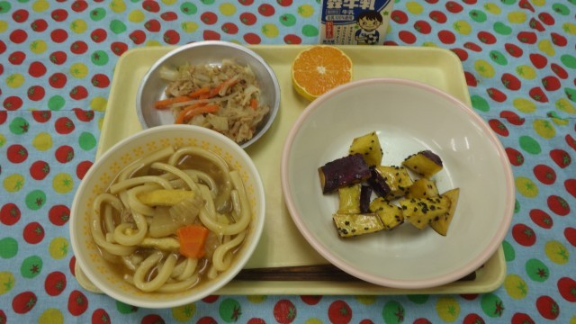 カレー南蛮 切り干し大根のサラダ 大学芋 菊花みかん 牛乳