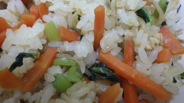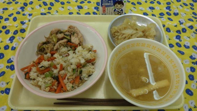 にんじんごはん 鶏肉の香味炒め かぼちゃのみそ汁 おかかキャベツ 牛乳