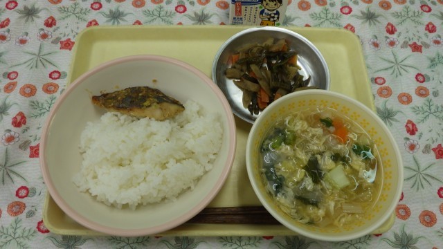 ごはん さごちのごま味噌焼き かきたま汁 茎わかめの当座煮 牛乳
