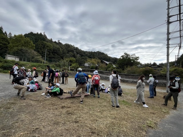 今日は、全校遠足です。空は、所々うっすらと青空を覗かせています。