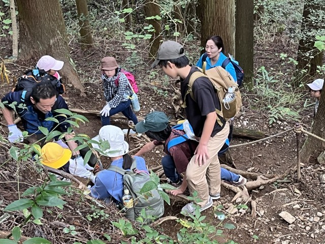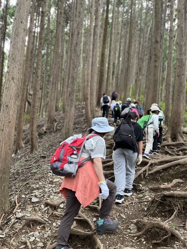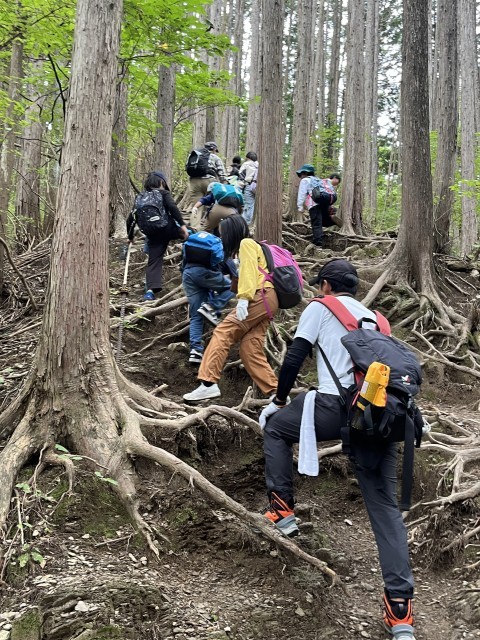 山道の中には、急な坂があり、根っこやロープにつかまって上る場所もあります。上から手を引っ張ったり、下から持ち上げたりと助け合って登っています。