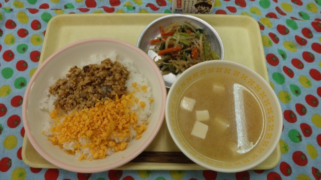 二色そぼろ丼 小松菜とじゃこ炒め 具だくさんのみそ汁 牛乳