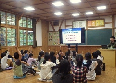 【上】学び舎で浅川の魚を中心にしたお話を聞きました。元々いない種類の魚が持ち込まれると、近縁同士交雑したり、すみかを奪われたりして、絶滅することがあるそうです。東京都のレッドデータブックも紹介されました。