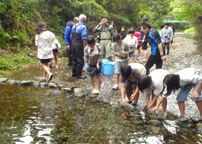 【中】お話の後、3年生以上の児童は本校の前を流れる醍醐川に入り、ヤマメが産卵しやすいように流れを整えます。大きな石で堰を作り、中を小石で平らにならします。この時、水温も気温も15℃でした。