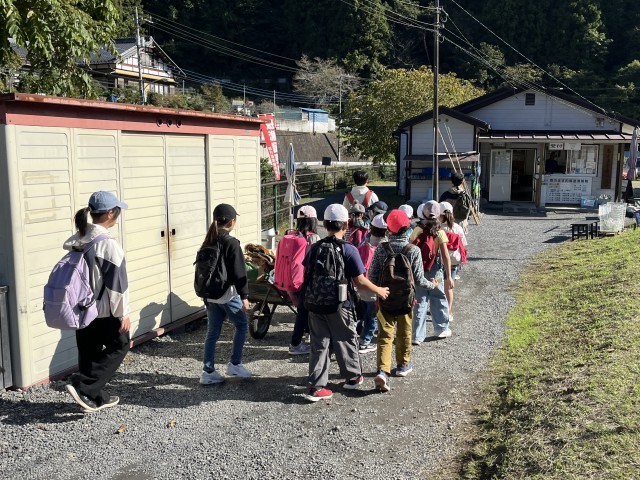 今日は、3、4年生マス釣り体験学習のため、学校からマス釣り場まで歩いて行きました。