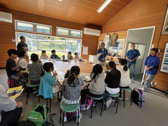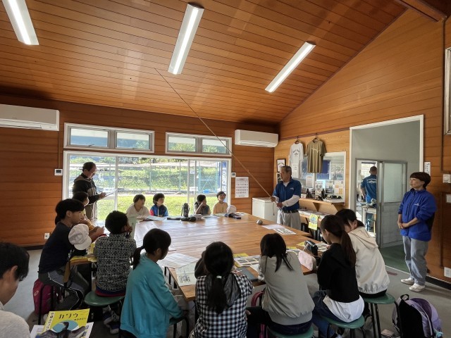 子どもたちは熱心にお話しを聞いたり、質問したりしました。今日、体験で使う竿についても尋ねました。この釣り場では、餌付けの釣りとルアー釣りがあるそうです。みんなが体験するのは、餌を付ける釣りだそうです。