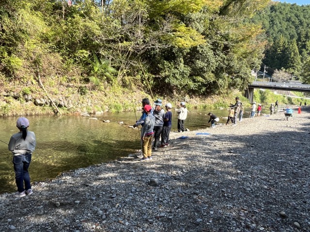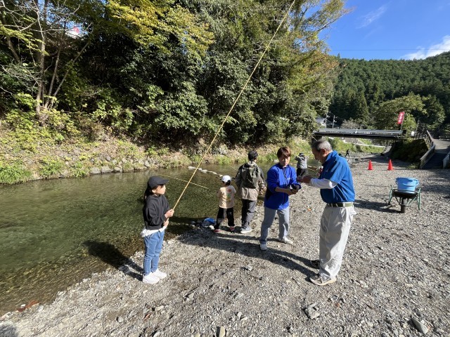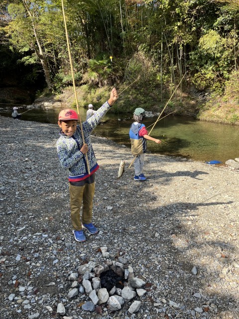 釣りに慣れてくるとどんどん釣れるようになりました。釣り上げると、とても大きなマスでした。一人で3匹も4匹も釣る人がいました。ヤマメの小さい魚やカワムツ、アブラハヤなどを釣った人もいましたが、全員1匹は釣れたので良かったです。また、ブドウムシを触れなかった3年生も釣りたい気持ちが勝り、勇気を出して餌付けにチャレンジしていました。この経験は、自信につながったようです。