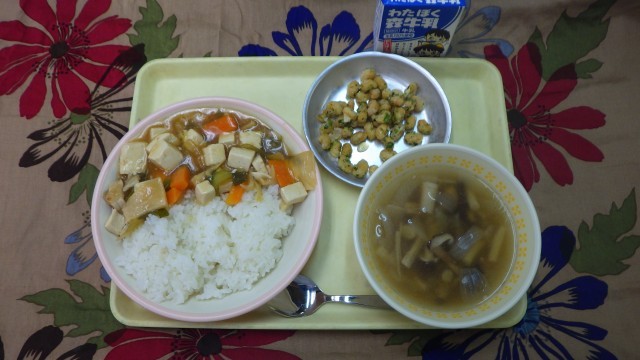 ごはん・四川豆腐・きのこスープ・ポップビーンズ・