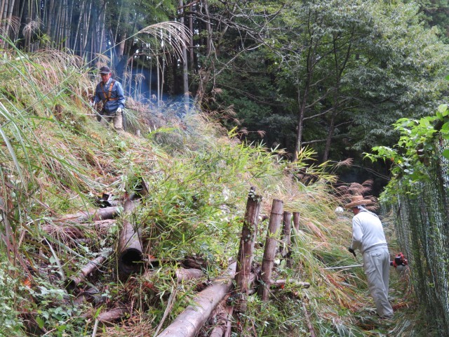 今回は、校舎裏の山の斜面と駐車場の草刈り、フェンスのつるはがし等を行いました。
