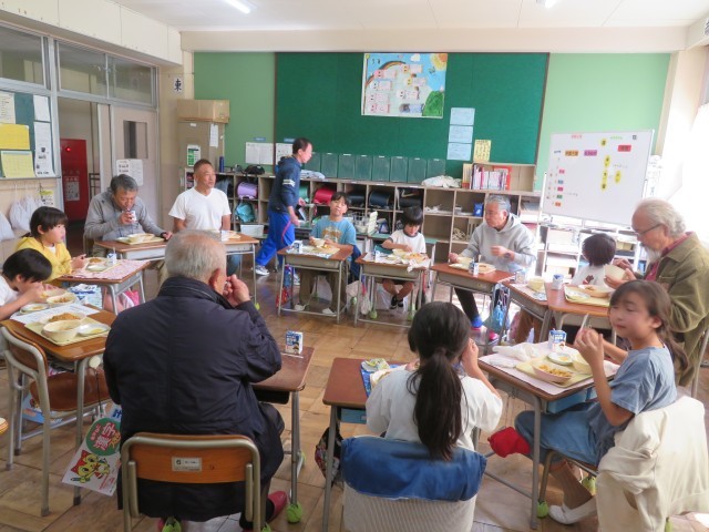 4校時が終わり、給食を地域の方と一緒に摂りました。3年生は机を円く並べて食べました。