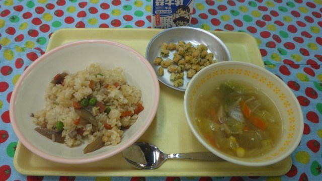 とりごぼうピラフ 白菜スープ ポップビーンズ 牛乳
