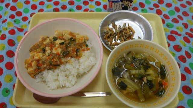 学校のマーボー豆腐は、1年生から6年生まで食べられるように辛さ控えめに作っています。