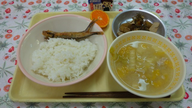 ごはん ししゃもの香り揚げ 大歳のごっつお 白菜とえのきの味噌汁 牛乳