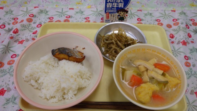 ごはん さわらの幽庵焼き かぼちゃすいとん もやしのからしあえ 牛乳