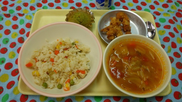 コーンピラフ 鶏の唐揚げ ミネストローネ 桑都カップケーキ 牛乳