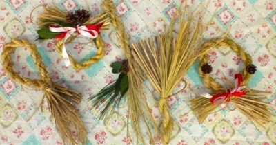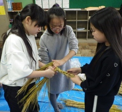 日本では昔から稲作が生活や習慣に深く結びついています。まとめとして稲わらを使った正月飾りを作りました。講師の元本校教員から、数種類の作り方を教わりました。ポイントは、濡らして柔らかくなったわらをきつく締め、よりをかけていくことです。協力することで素敵な飾りができました。
