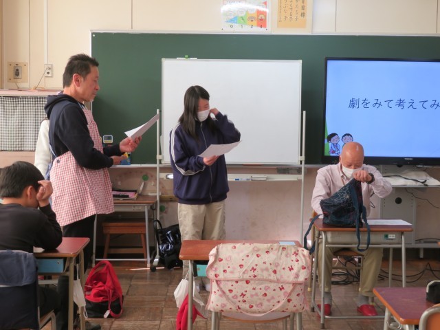 次の劇のテーマは、おじいさんの財布が見つからず、嫁さんや孫のせいにするという内容です。最初の悪い例では、いつものカバンにおしいさんの財布がなく、嫁さんや孫が財布を取ったと言ってもめるシナリオでした。次の良い例は、優しい声掛けをして一緒に探し、おじいさん自らが別のカバンから財布を見つけ出したというシナリオでした。2つのテーマで劇を通して感じたことを発表し合いました。