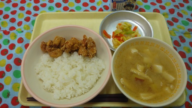 ごはん 鶏肉の唐揚げ 浅漬け さつま芋の味噌汁 牛乳