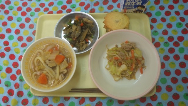 みそにこみうどん・豚しゃぶサラダ・くきわかめの