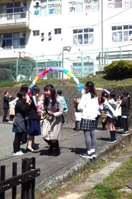 写真は在校生とのお別れで花のアーチをくぐるところです。
