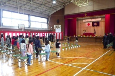 【上】今年度は始業式の翌日が入学式です。恩二小は在校生もみな参加します。校長先生はキリンの絵を示して『首を長くして入学を待っていました』、またイルカの絵で『イ;一生懸命がんばろう ル;ルールを守ろう カ;感謝の気持ちを忘れずに』というお話をしました。新入生自己紹介では、元気よく自分の名前を言うことができました。児童の歓迎のことばの最後に『夕焼小焼』を歌いました。2名の1年生を迎え、28名でスタートです。