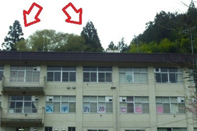 【下】校舎の窓に『入学おめでとう』の文字パネルを掲示しています。校舎の背後、裏山の樹木のシルエットが「猫の耳」に見えますか?
