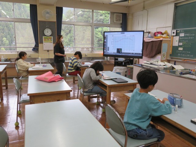 上と中の写真:4年生は、算数で「折れ線グラフ」の単元を学習していました。習熟度別で、2教室に分かれて行っていました。グラフの単位や目もりに気を付けて、グラフを読み、そこから分かる情報を1つ1つ丁寧に確認しながら課題に答えていました。