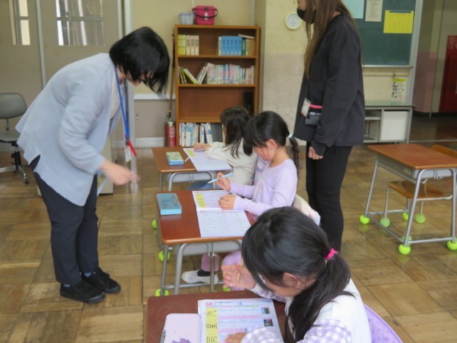 下の写真:2年生は、時間講師の先生と新出漢字を学習していました。「汽」と「星」の2文字を習いました。正しく鉛筆を持って、正しい筆順で丁寧にドリルに書いていました。左手はしっかり紙を押さえ、姿勢もよく、意欲を感じました。