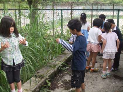 1年生は視聴覚室のそばの池から、ビオトープに移動して、モリオアオガエルの卵などを観察していました。そこでも子供たちから元気な歓声が聞こえました。