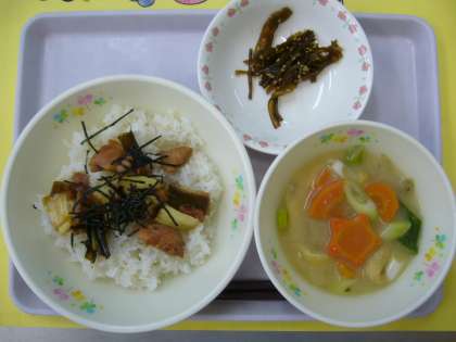 「やきとり丼」「呉汁」「茎わかめの当座煮」「牛乳」でした。