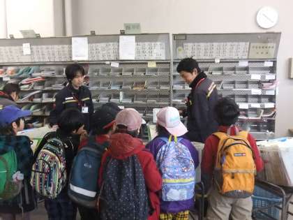 先日、2年生が恩方郵便局に見学に行きました。郵便局で2年生の8名の子供たちは熱心に見学をしていました。その様子を紹介します。