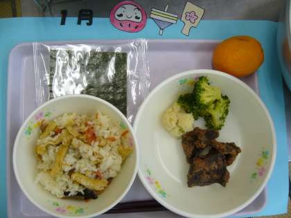 「五目ごはん」「鯨の竜田揚げ」「花野菜のサラダ」