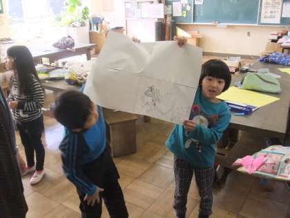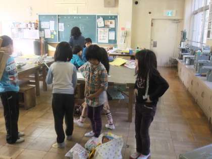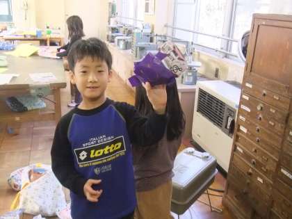 印刷室で印刷をしていたら、隣の図工室からとっても楽しそうな1年生の声が聞こえてきたので図工室をのぞいてみたら・・・あ 副校長先生!みてみて!というので見てみたら、いらない袋を使って「これ枕!これ人形!」などと説明して見せてくれました。