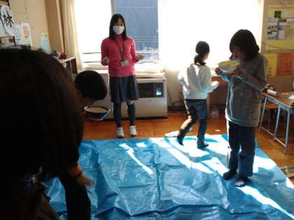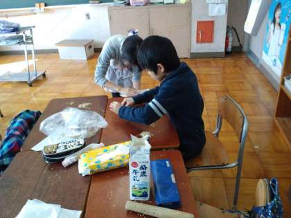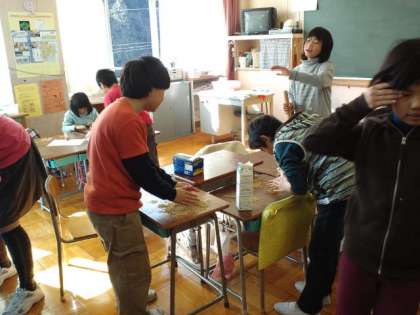 4年生の教室をのぞいてみると、自分たちで育てた稲を教室で脱穀しもみすりをしていました。