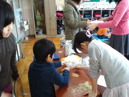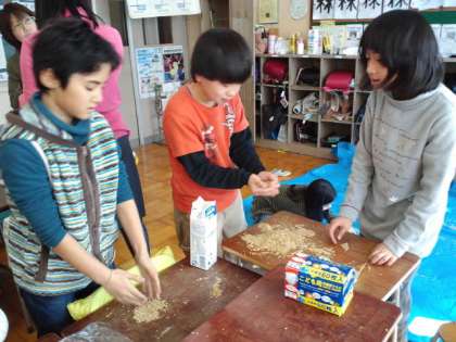 4年生の教室をのぞいてみると、自分たちで育てた稲を教室で脱穀しもみすりをしていました