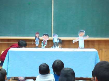 先週の保健集会では、保健委員会の子供たちがペープサート等を使って、インフルエンザの予防の劇をしてくれました。とても分かりやすくいい発表をしてくれました。紹介します。