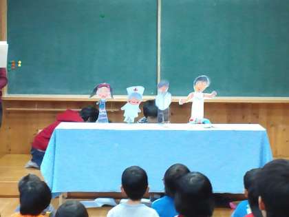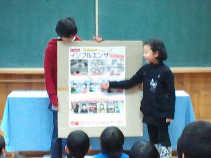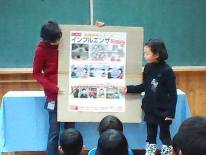 先週の保健集会では、保健委員会の子供たちがペープサート等を使って、インフルエンザの予防の劇をしてくれました。とても分かりやすくいい発表をしてくれました。紹介します。