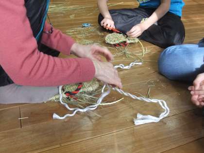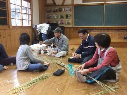 先日5年生が視聴覚室で岡本さん、田代さん、臼井さんの3人のゲストティーチャーの方を迎えて、わら細工を行いました。本校では毎年、自分たちの収穫した稲のわらを使用して、わら細工体験を行っています。わら細工は、自分の足に合わせた、わら草履を中心に作っています。