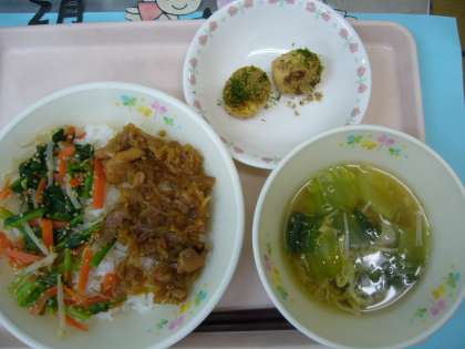 「ビビンバ」「チンゲンサイのスープ」「がんも焼き」「牛乳」でした。