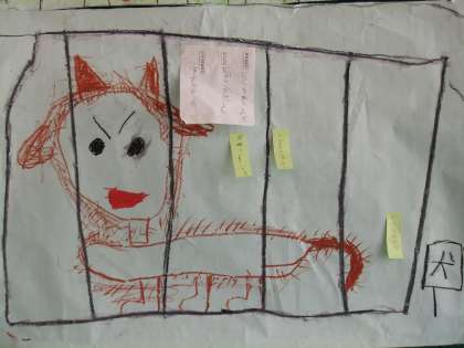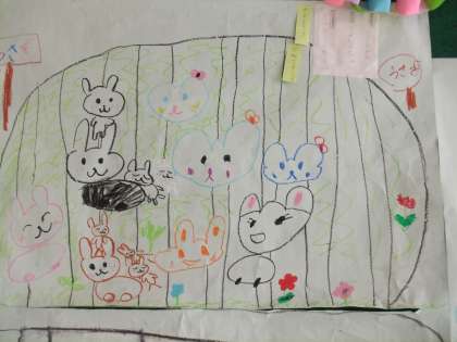 1年生の授業を参観に行ったら、「おはなし動物園」という掲示物があり、思わず見とれてしまいました。子供たちが協力し合って書いた絵ですね。
