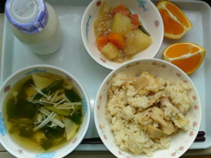 今日の給食は、タケノコご飯、新ジャガソボロあん、しんじょのお吸い物、果物、牛乳です。タケノコは先日2年生と飼育栽培委員会の子達が掘ってくれました。21本ありました。