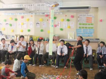 先日、6年生を送る会が音楽室でありました。みんなで「ひまわり」を歌ったり、各学年出し物があり、すごくどの学年も工夫していて立派でした。、6年生の出し物もさすが6年生でした。また、最後に久寿玉もあり素晴らしい6年生を送る会でした。