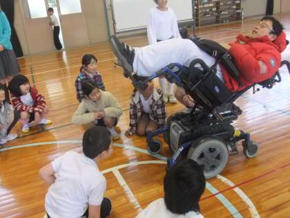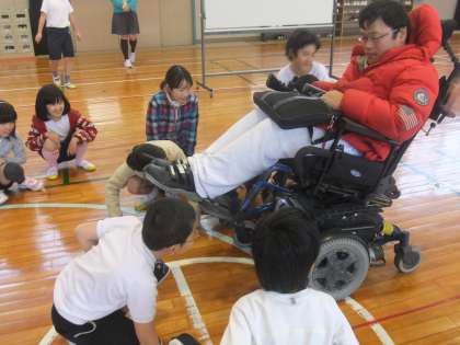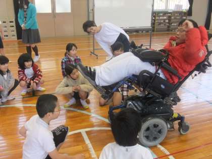 先日、4年生が福祉学習で車椅子体験をしました。はじめに、車椅子で生活している人の話(杉浦さん)を聞きました。杉浦さんは子供たちにとってもいい話をしてくれました。子供たちも真剣に聞いていました。その後、社会福祉協議会の松本さんが車椅子を持ってきてくださいましたので、車椅子に乗る体験を車椅子を押す介助者の両方の体験をしました。