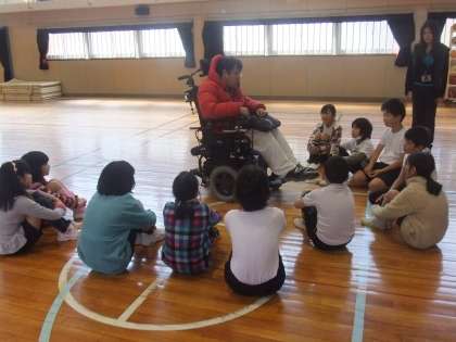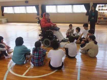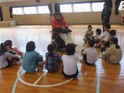 先日、4年生が福祉学習で車椅子体験をしました。はじめに、車椅子で生活している人の話(杉浦さん)を聞きました。杉浦さんは子供たちにとってもいい話をしてくれました。子供たちも真剣に聞いていました。その後、社会福祉協議会の松本さんが車椅子を持ってきてくださいましたので、車椅子に乗る体験を車椅子を押す介助者の両方の体験をしました。