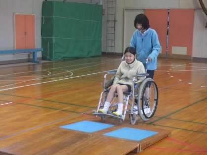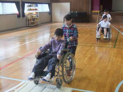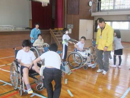 先日、4年生が福祉学習で車椅子体験をしました。はじめに、車椅子で生活している人の話(杉浦さん)を聞きました。杉浦さんは子供たちにとってもいい話をしてくれました。子供たちも真剣に聞いていました。その後、社会福祉協議会の松本さんが車椅子を持ってきてくださいましたので、車椅子に乗る体験を車椅子を押す介助者の両方の体験をしました。