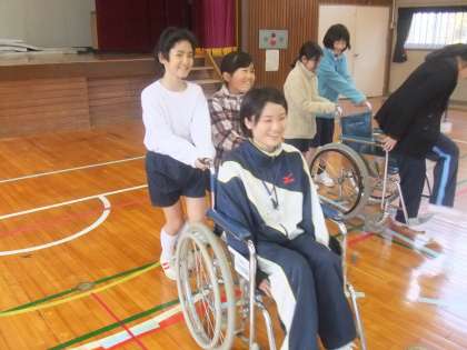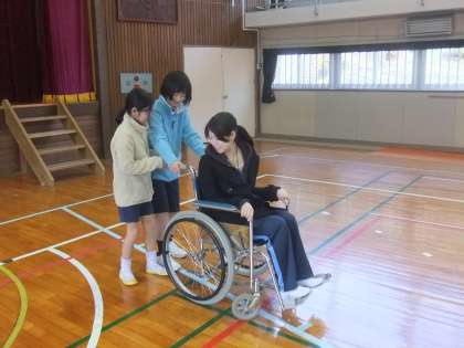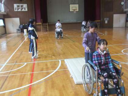 先日、4年生が福祉学習で車椅子体験をしました。はじめに、車椅子で生活している人の話(杉浦さん)を聞きました。杉浦さんは子供たちにとってもいい話をしてくれました。子供たちも真剣に聞いていました。その後、社会福祉協議会の松本さんが車椅子を持ってきてくださいましたので、車椅子に乗る体験を車椅子を押す介助者の両方の体験をしました。