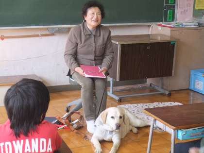 今回の福祉学習の紹介は、昨年度も来てくださいましたが、盲導犬と暮らす龍崎さんの話と点字体験、アイマスク体験を行いました。