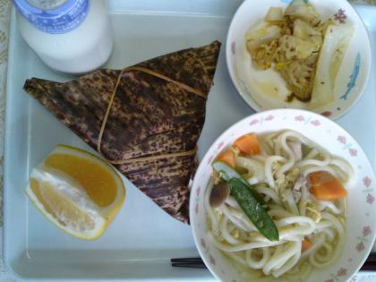 今日の給食は、中華チマキ、タマゴとじうどん、キャベツの梅コンブ、果物、牛乳です。
