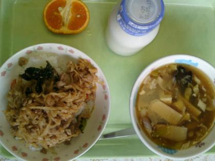 今日の給食は、ビビンバ、スーラータン、果物、牛乳です。